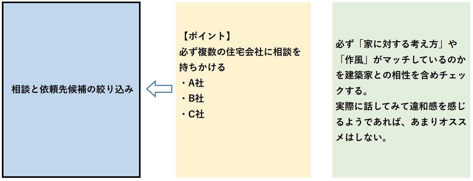 まずは、それぞれが建てたい家のイメージによって依頼先のタイプを絞り込み、その上で、それぞれの依頼先タイプに合わせた、依頼先の情報収集を行い、見学や相談をして、複数社まで候補を絞り込み、最終的に一社に依頼するようにしてください。