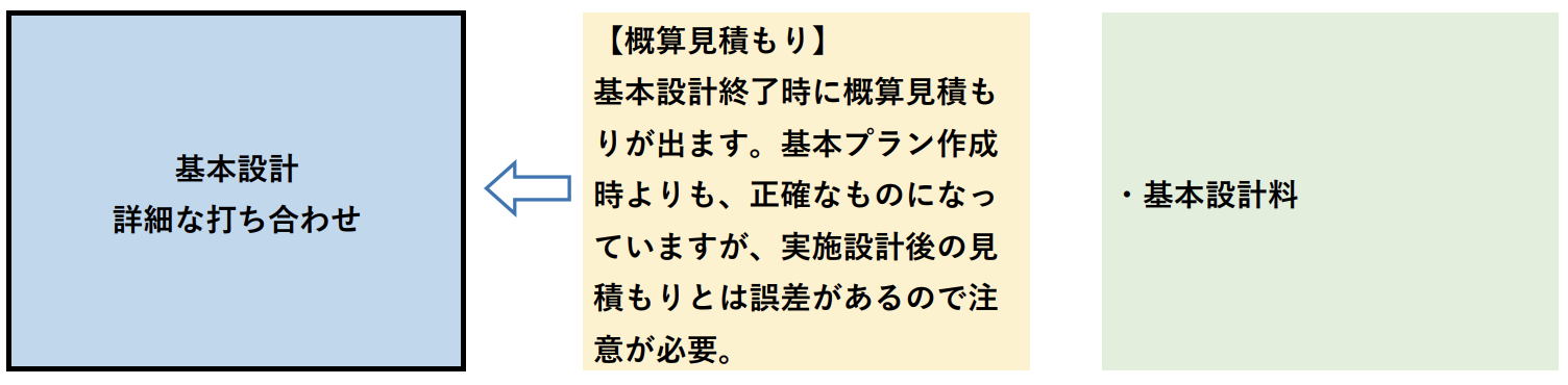 基本設計時には、「概算見積もり」も出していきますが、この時提出される「概算見積もり」は、前回の基本プランの作成よりも、より具体的で詳細な内容の「概算見積もり」となります。