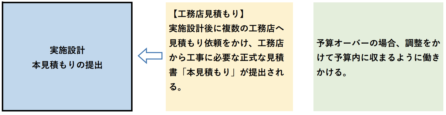 つまり、設計事務所(建築家)に依頼した場合は、この段階で、工務店に工事の見積もりを依頼し、「正式な工事見積書(本見積もり)」が完成します。