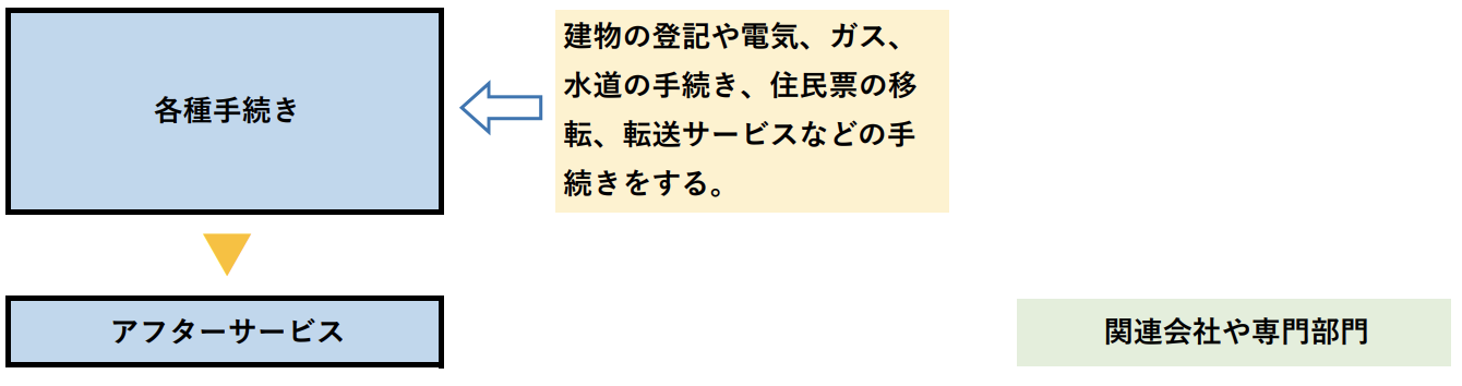 建物の登記や生活に必要な電気、ガス、水道の手続きを行い、住民票の移転や、郵便転送サービスなど各種手続きを行います。