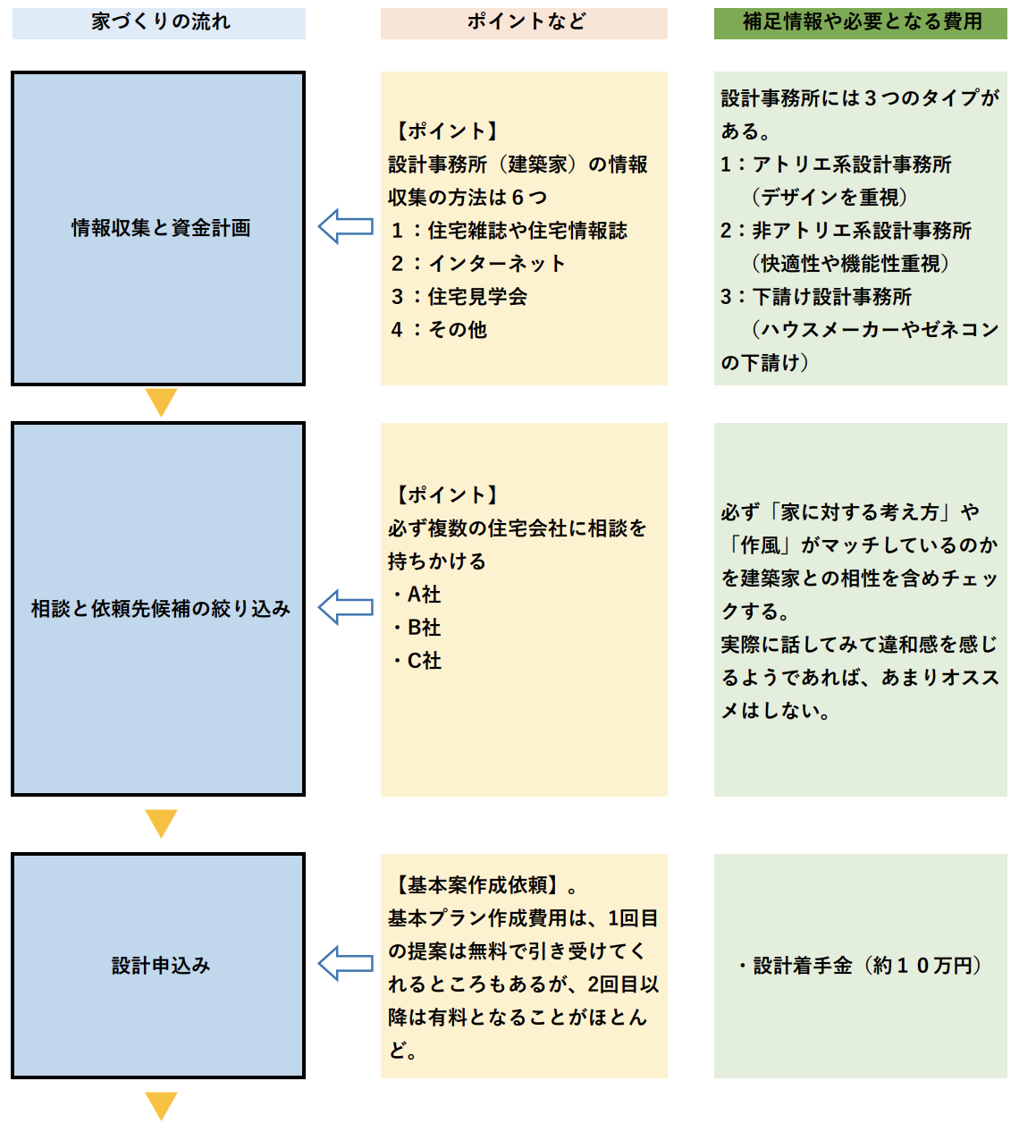 つづいて「2:準備期」では、依頼先を絞り込み、依頼先の担当者と話し合い、家の設計図をつくっていきます。