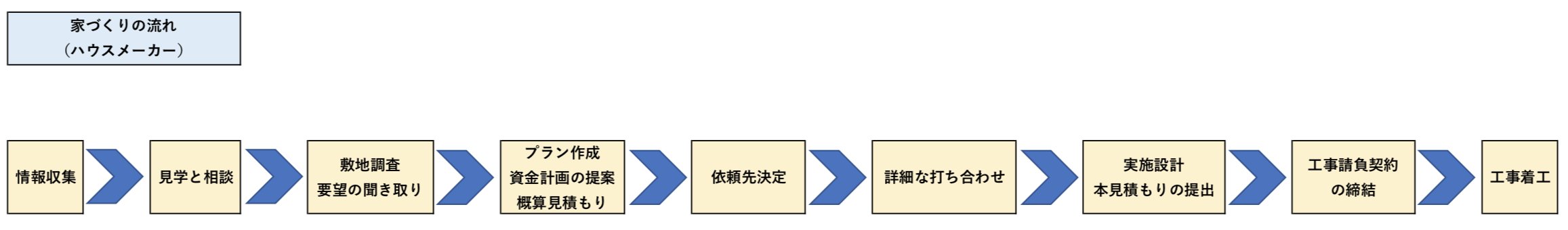 ハウスメーカーで、注文住宅の家づくりをする場合の、一般的な流れは下記の通りです。