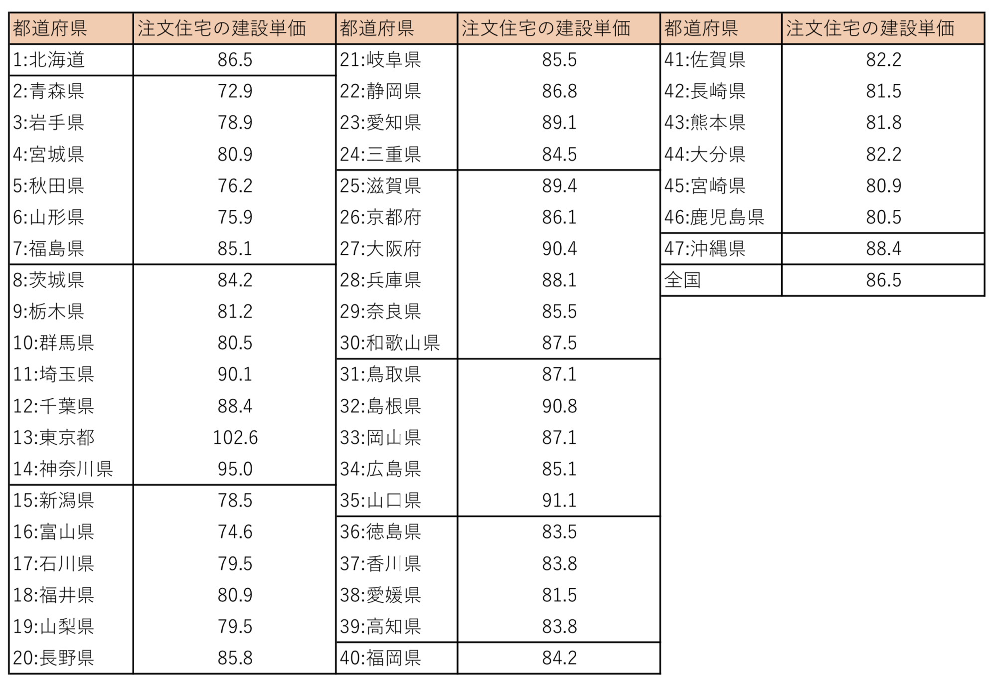 表を見ても分かる通り、日本国内では東京都の建設坪単価が最も高く、1坪あたり102.6万円、最も坪単価が安い都道府県は、青森県の72.9万円となっています。