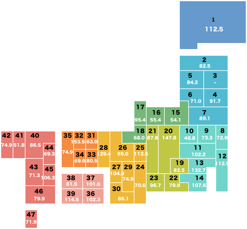 注文住宅の地域別坪単価を、日本地図に落とし込んだ図を下記に作成しましたので、より直感的に、建設予定地の坪単価を調べていただくことができるかと思います。