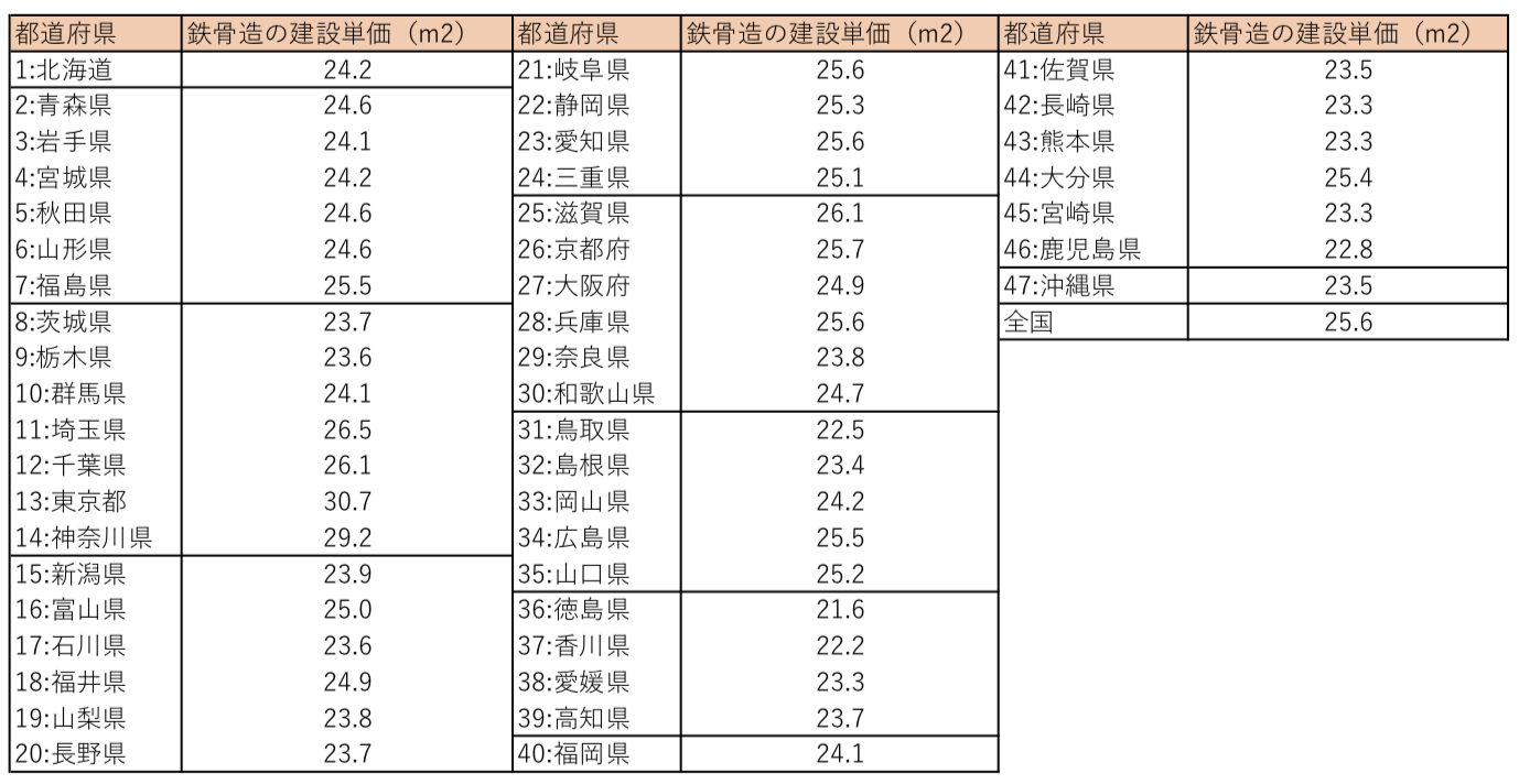 鉄骨造の場合の建設単価は全国で25.6万円と、木造の18.0万円と比較すると建設単価が高いことがわかります。