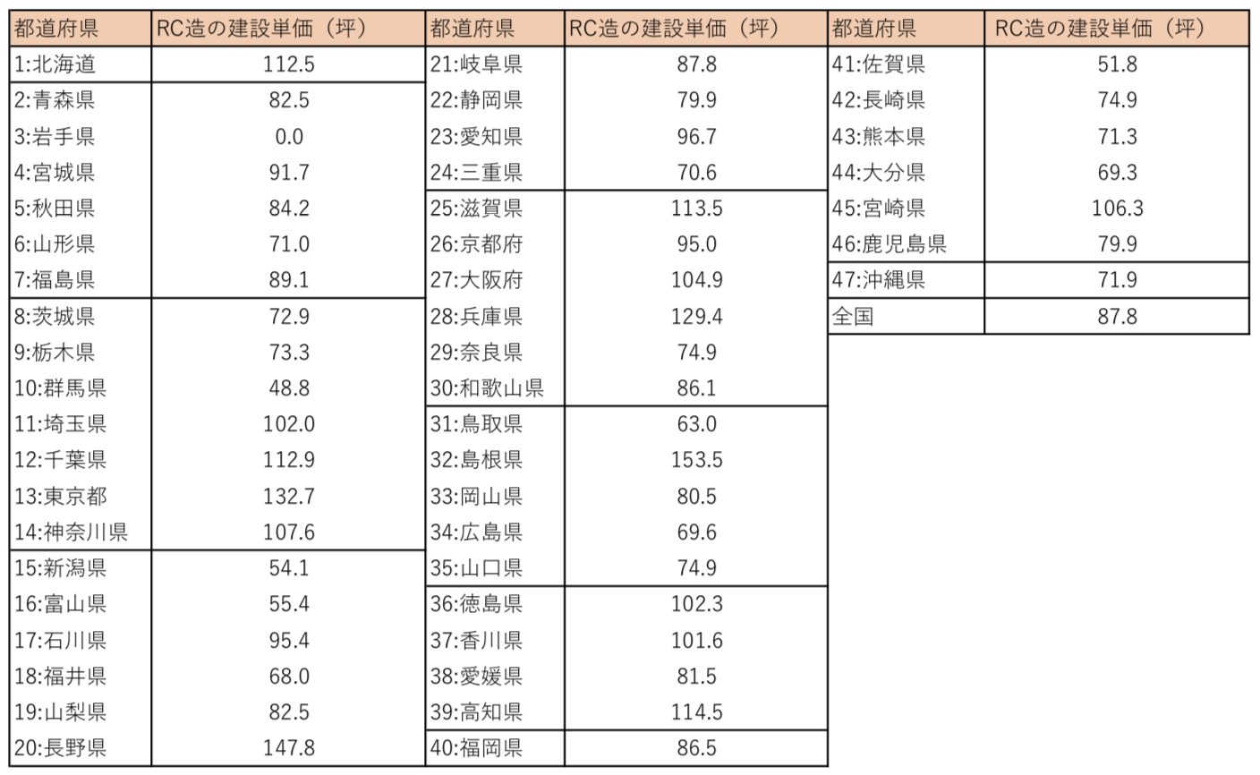 【RC造】の都道府県別、一平方メートル(m2)の建設単価