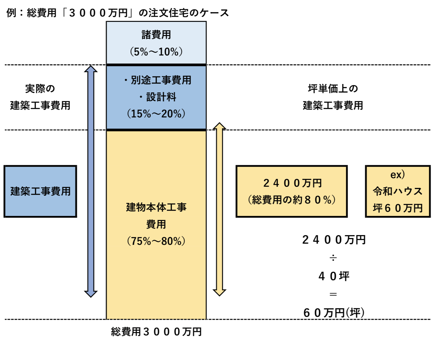 つまり、実際の建物は「坪単価」に「本体工事費以外の費用(別途工事費 + 諸費用)」を足した費用が必要となります。