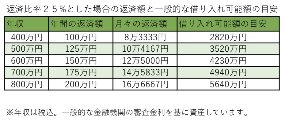 返済負担率を25%とした場合の返済額と一般的な借入可能額の目安については、下記の表を参考にしてください。