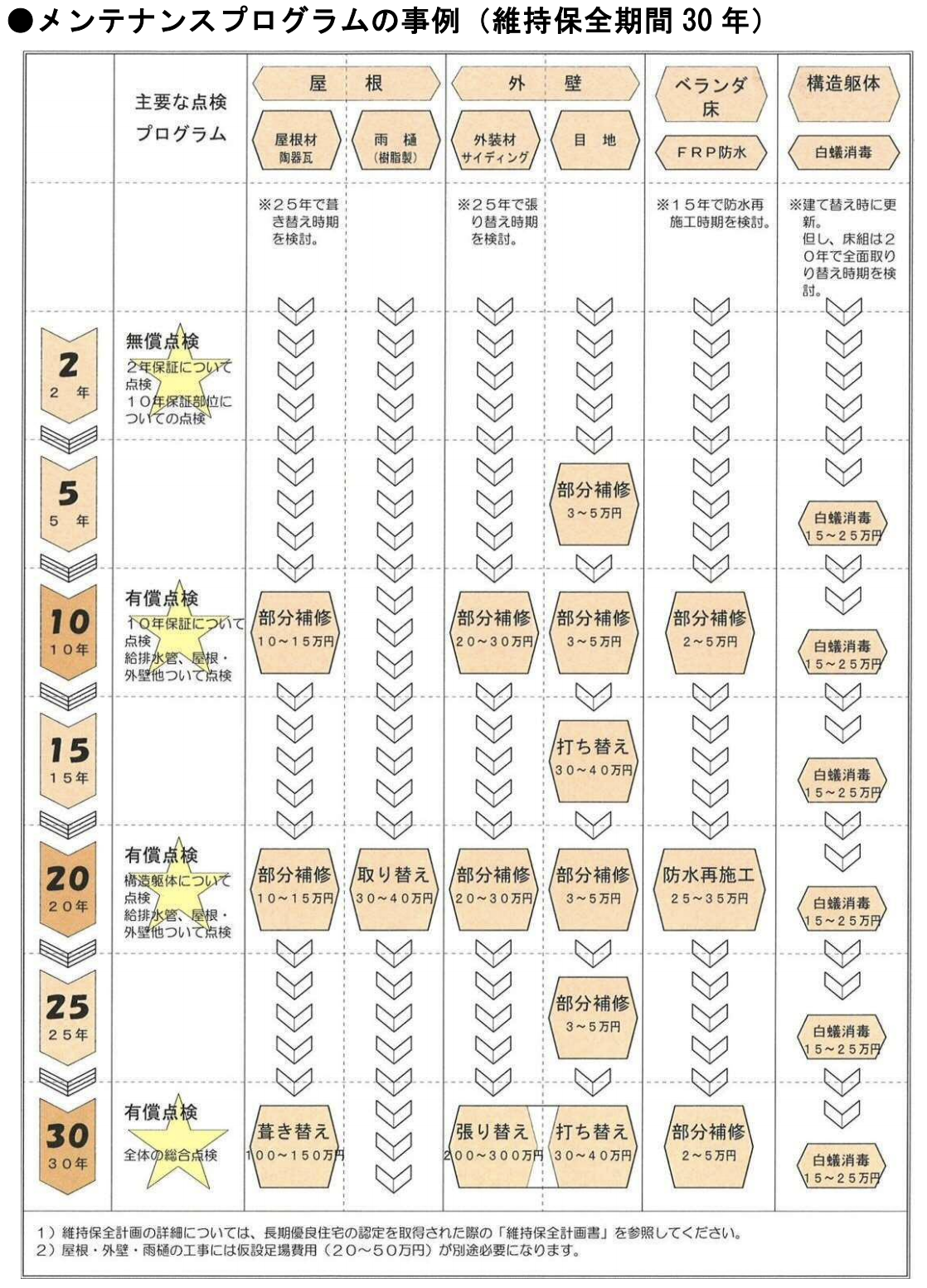 さらに、構造躯体のシロアリ駆除をする費用として、およそ5年毎に「防蟻処理」が必要となり、「白蟻消毒」のために15万円から25万円ほどの費用が必要となります。