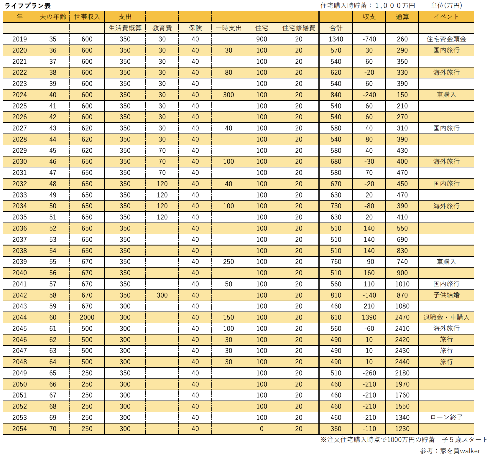 下記の表は、夫が35歳の時に注文住宅を購入した場合のライフプランシュミレーションです。