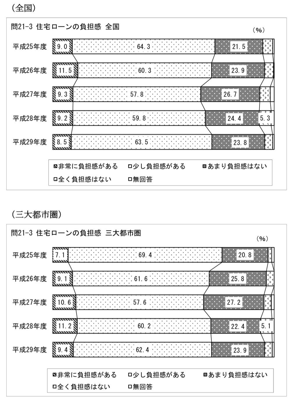 住宅ローンの負担感については「非常に負担感がある」と「少し負担感がある」としている人の合計が全国で72.0%、三大都市圏で71.8%と算出されています。