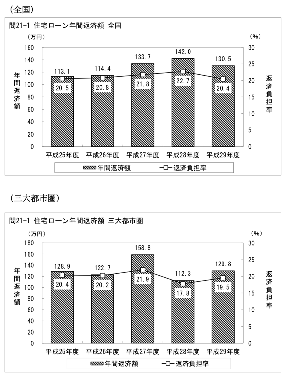 国土交通省の調べでは、住宅ローンの年間返済額は全国平均で130.5万円とされており、三大都市圏の平均では129.8万円となっています。