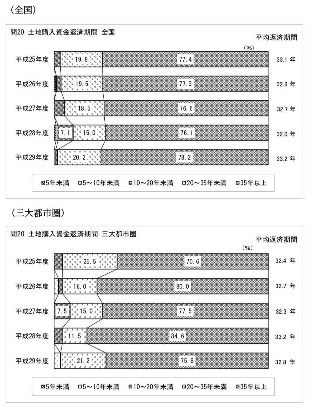 平均返済期間で見た場合、全国で33.2年、三大都市圏で32.8年となっています。