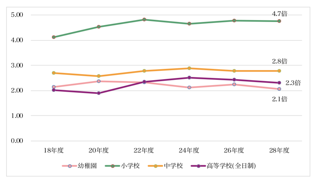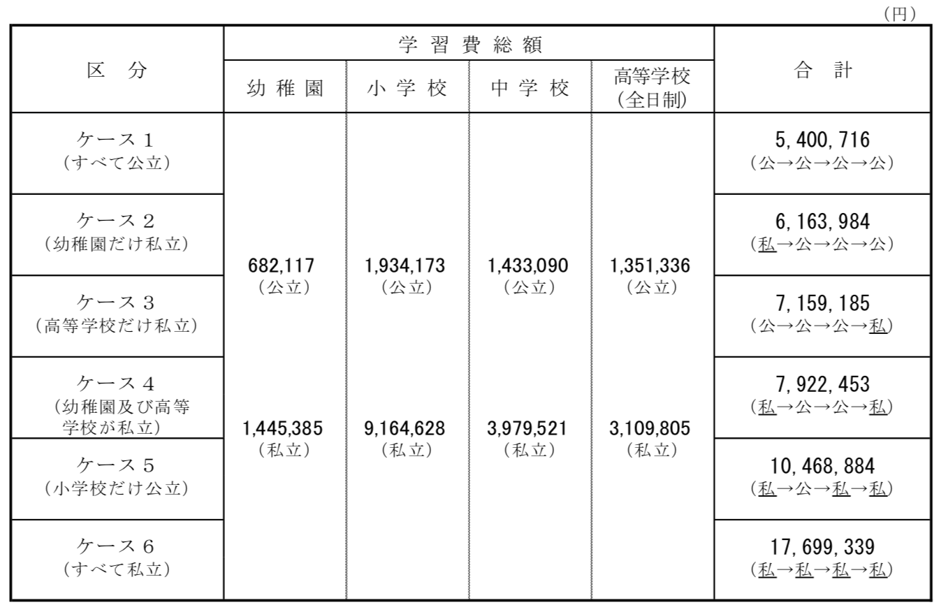 公立に進学した場合と、私立に進学した場合の学習費支出状況は違い、それぞれの「学習費支出状況」を比較すると、私立に通った場合は、公立に通った場合の「学習費総額」に対して、幼稚園では2.1倍、小学校では4.7倍、中学校では2.8倍、高等学校(全日制)では2.3倍になると試算されています。
