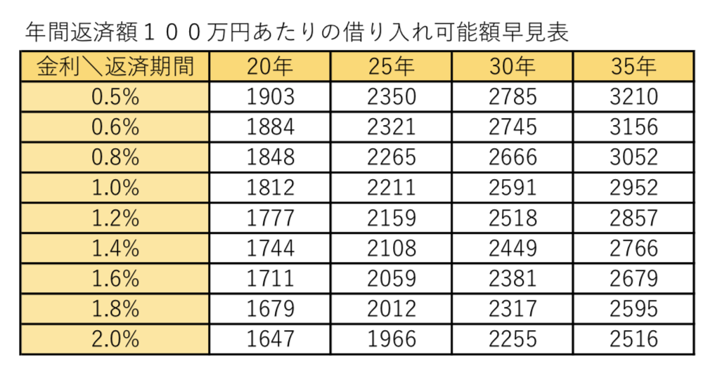 次に適切な借り入れ可能額を出すために、まずは年間返済額100万円あたりの借り入れ可能額を金利ごとに見ていきます。