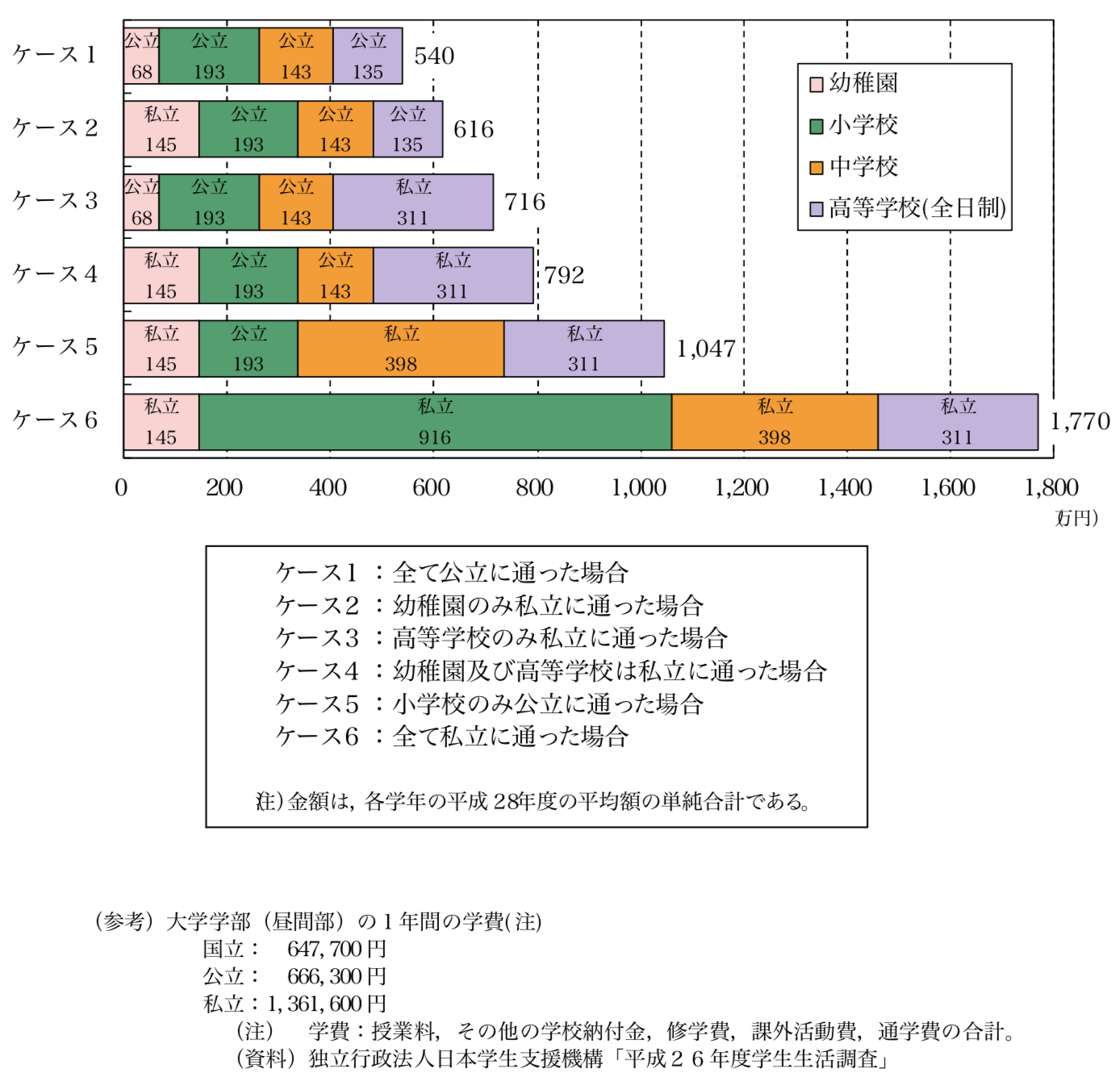 また、3歳から高等学校まで、全て、私立に通った場合の学習費用の総額は、約1,770万円かかると試算されています。