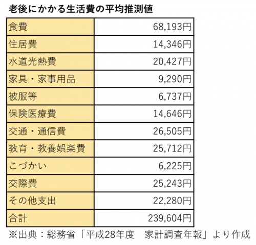 総務省の平成28年度の「家計調査」では、老後の生活費として毎月、平均23万9,604円かかると試算されています。