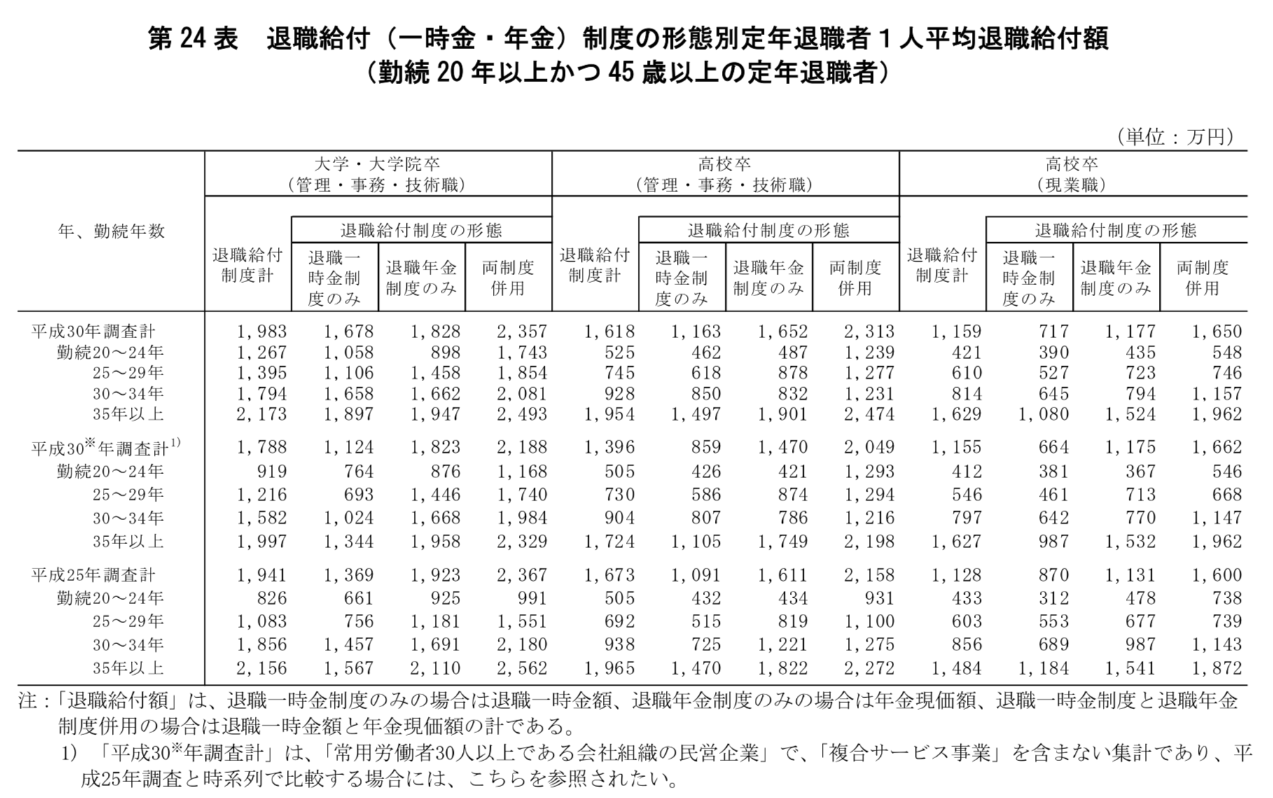 厚生労働省によれば「定年退職者の退職金の平均」は、下記の通りとなっていますので、参考にすると良いでしょう。