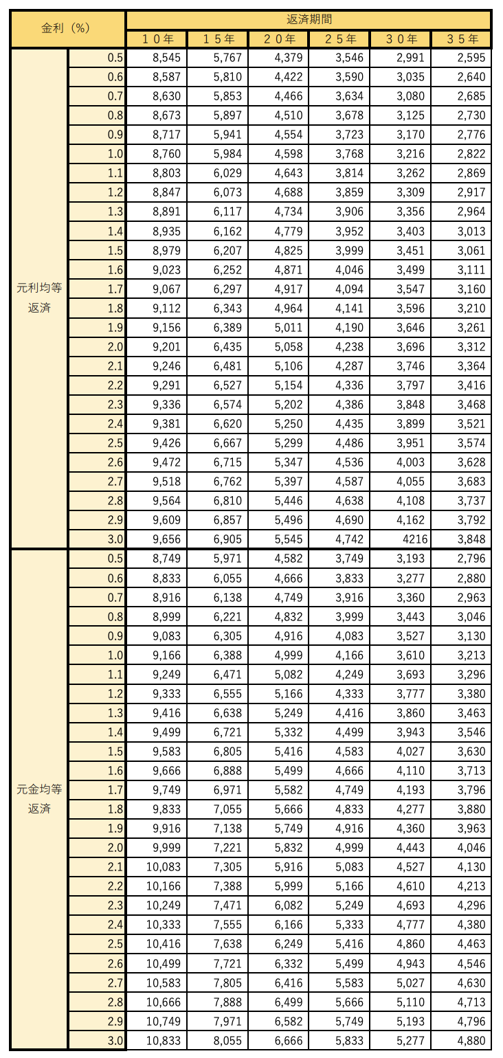 また100万円あたりの毎月返済額の表も、参考になるかと思いますので載せておきますので参考にしてください。