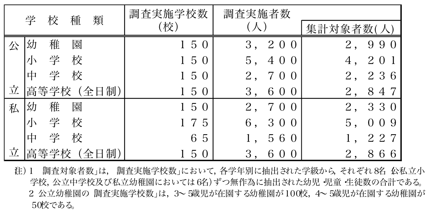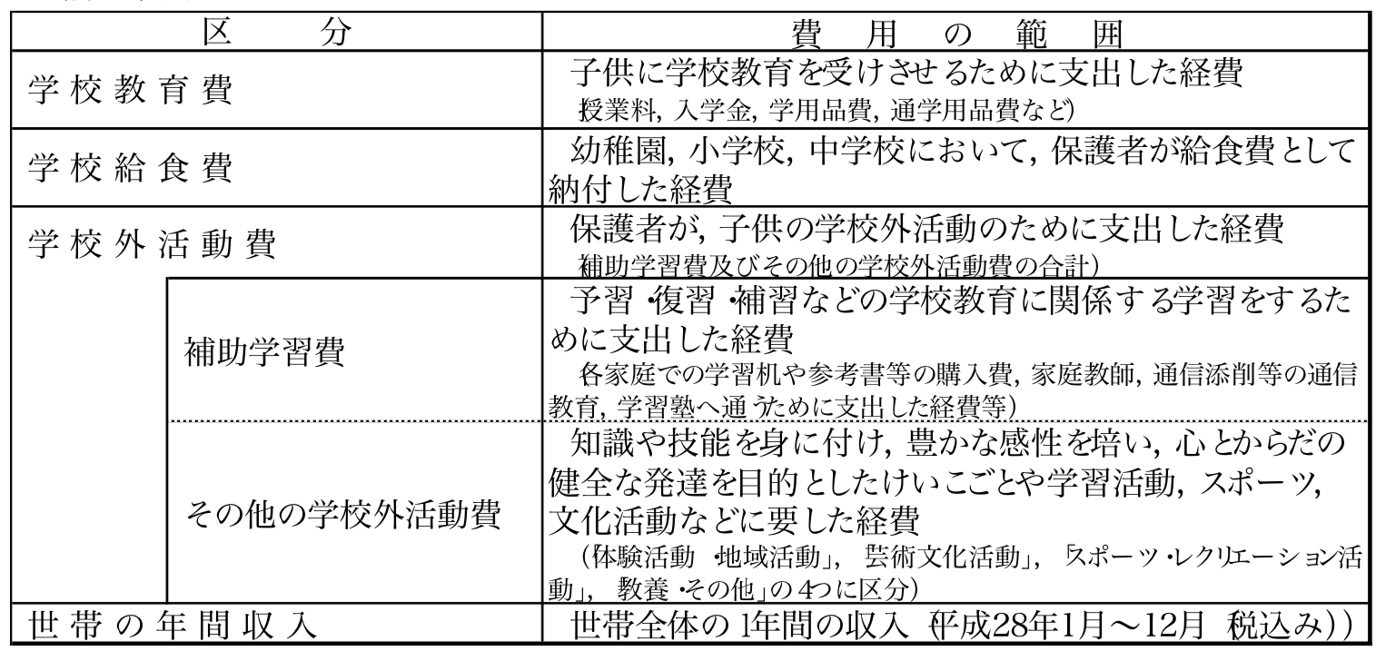 子供を公立又は私立の学校に通学させている保護者が,子供の学校教育及び学校外活動のために支出した経費並びに世帯の年間収入の実態をとらえ,教育に関する国の諸施策を検討・立案 するための基礎資料を得ることを目的とする。