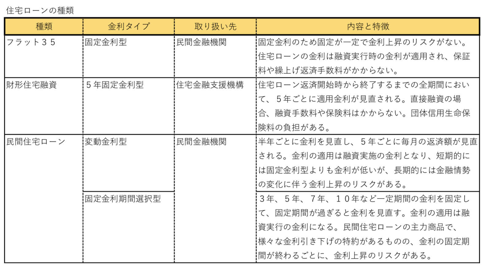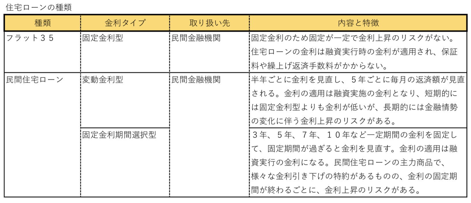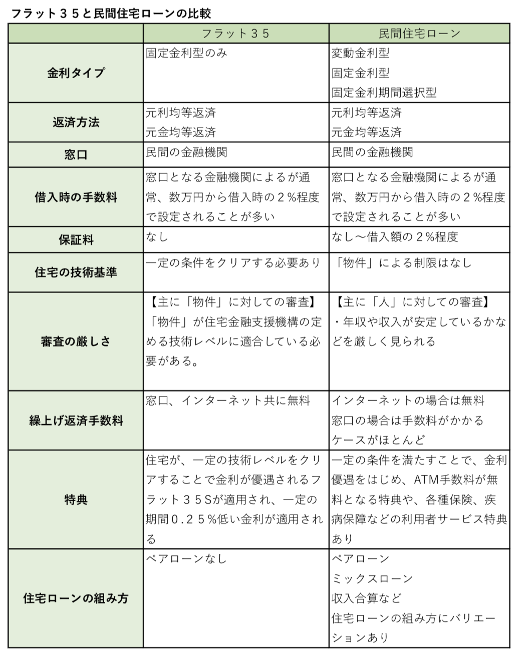 フラット35と民間の住宅ローンの比較をまとめると下記のようになります。