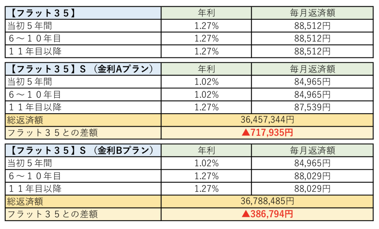 フラット35で住宅ローンを借り入れた場合と、フラット35Sで住宅ローンを借り入れた場合にはどの程度の差が生まれるのでしょうか。