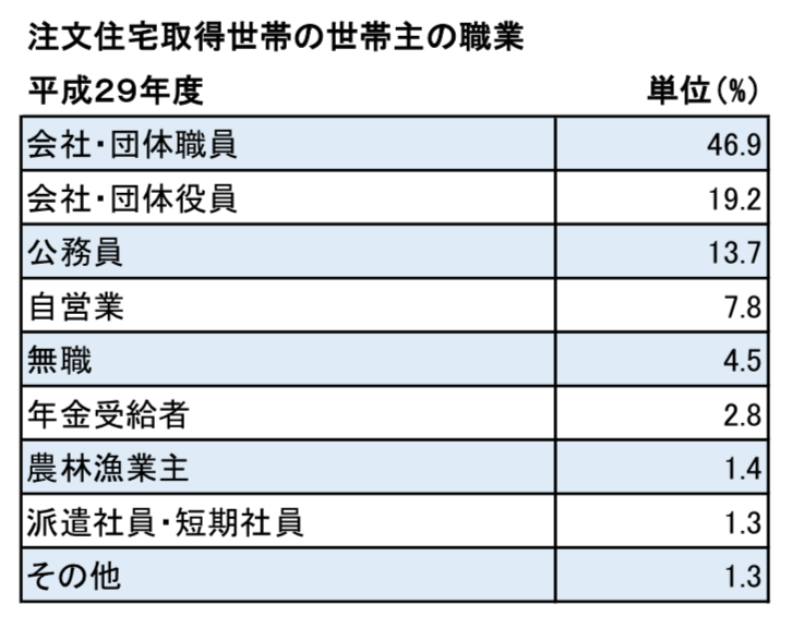 注文住宅取得世帯の、世帯主の職業を見ると面白い結果が表れています。