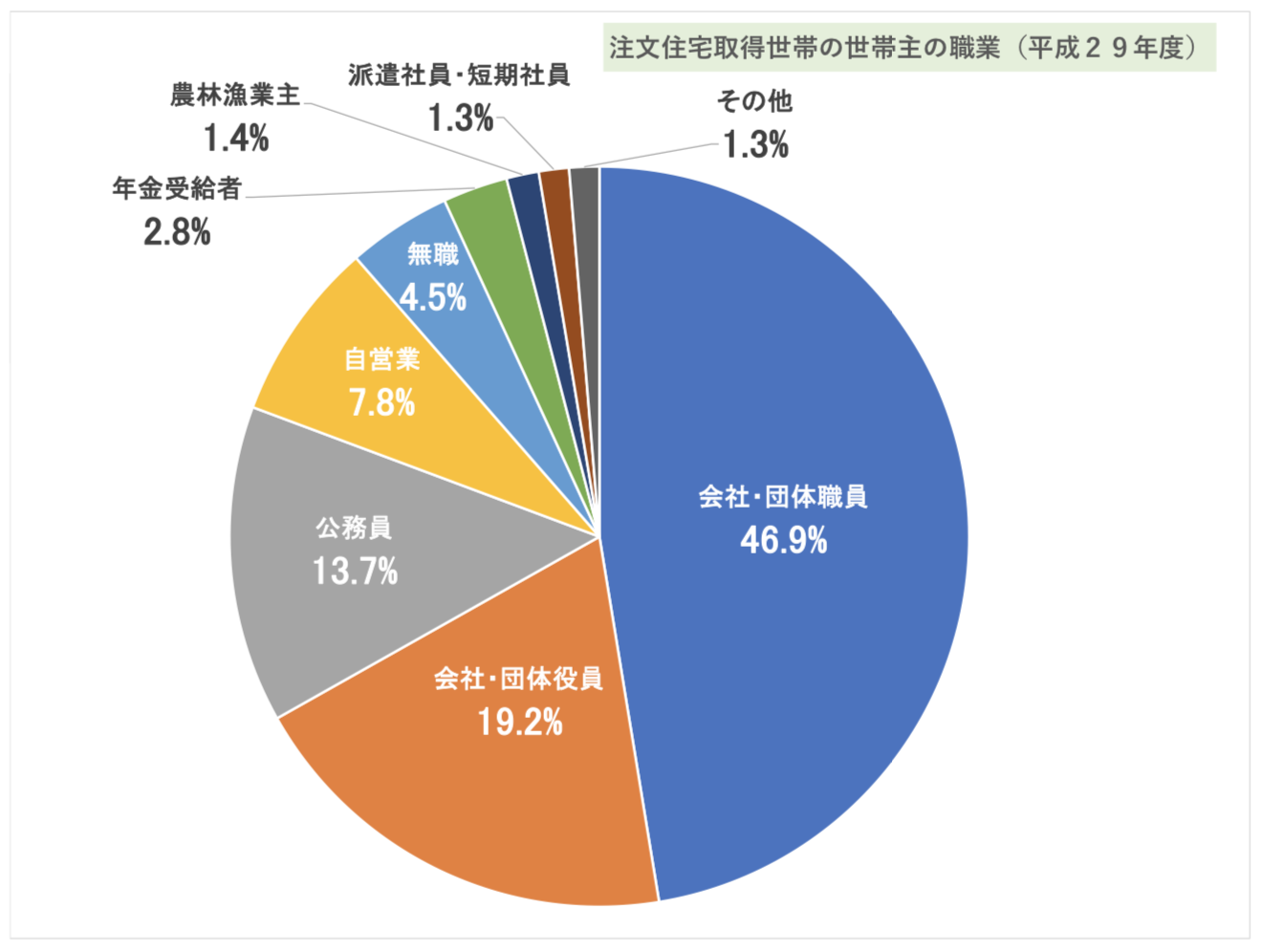 注文住宅取得世帯の、世帯主の職業を見てみると「会社・団体職員」が46.9%と、全体のおよそ半数を占めていることがわかります。