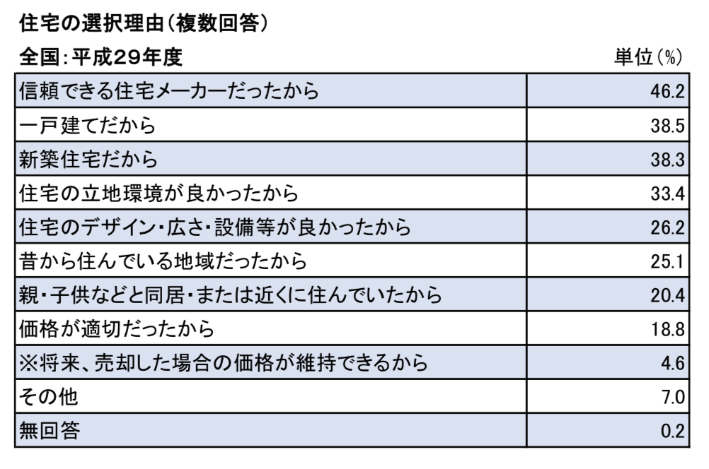 上記のように、「住宅のデザインや広さ、設備等が良かったから」という理由で選んだ方は、意外と少なく、全体の26.2%となっていることがわかります。