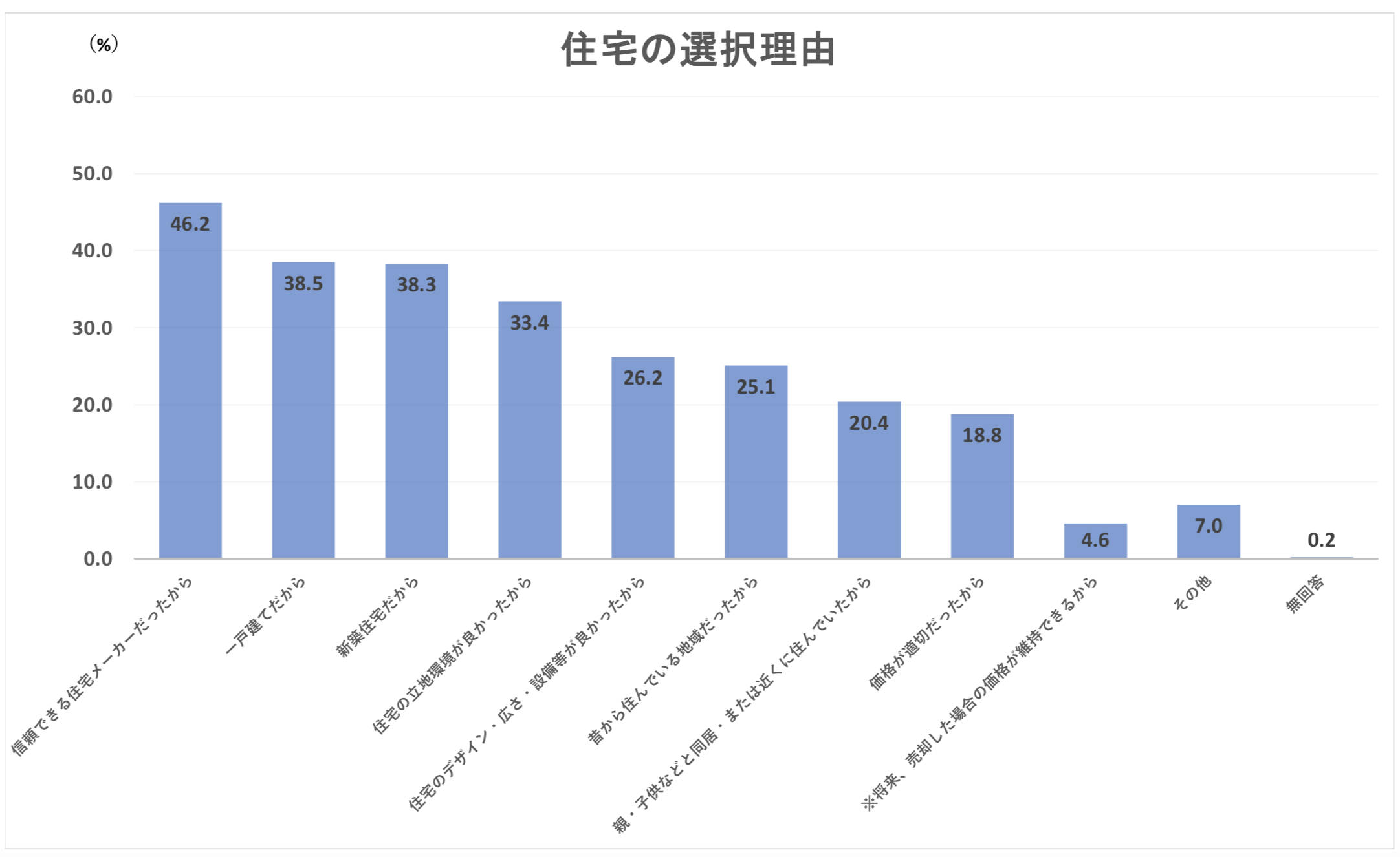 ちなみに、今回作成したグラフには記していませんが、「分譲戸建て」住宅の場合は「新築住宅だから」が56.3%、「住宅の立地環境が良かったから」が55.0%、「価格が適切だ買ったから」が40.8%、「住宅のデザイン・広さ・設備等が良かったから」が37.9%と続いています。