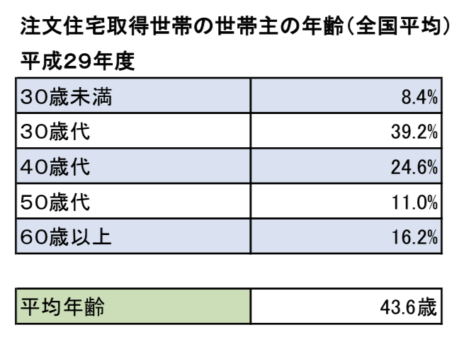 ただし、注文住宅取得世帯の世帯主の年齢を平均年齢でみると「43.6歳」という結果になっています。