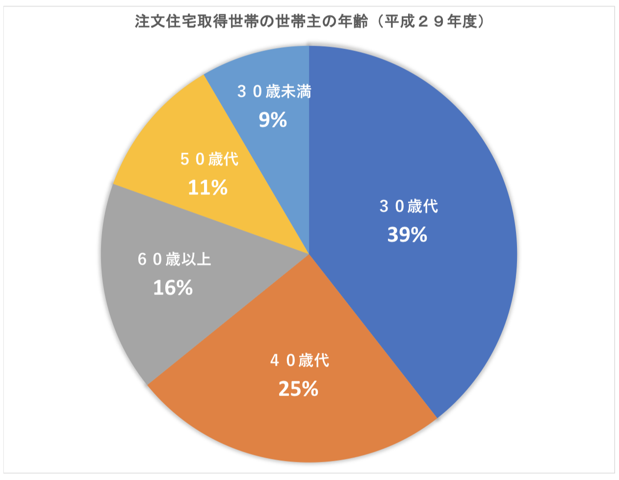国土交通省 住宅局の「平成29年度の住宅市場動向調査報告書」調べでは、注文住宅を取得した年齢のうち、「30歳代」が最も多く、全国平均で39.2%の方が「30歳代」で、注文住宅を建てていることがわかります(はじめて家を建てた方を対象とした統計です)。