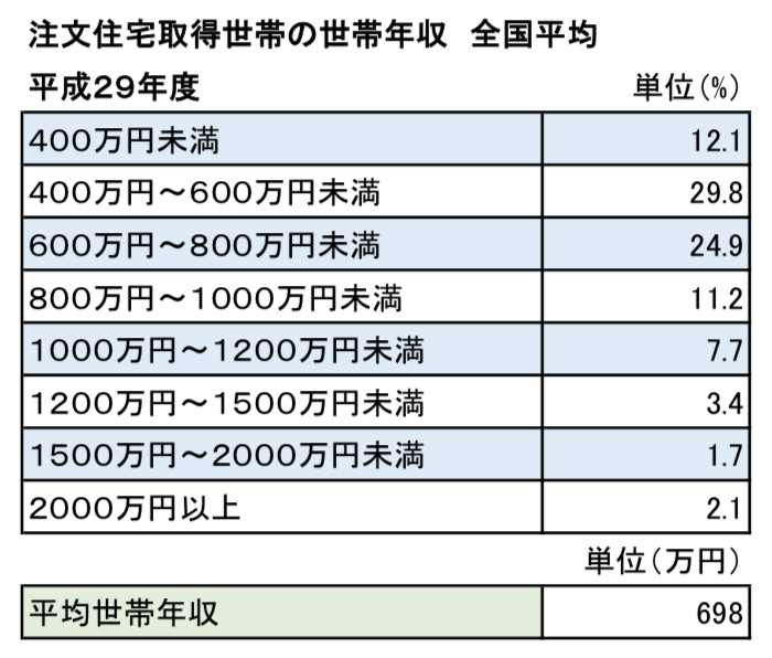 また、注文住宅取得世帯の世帯年収を、全国平均でみると698万円と算出されています。