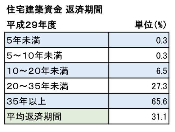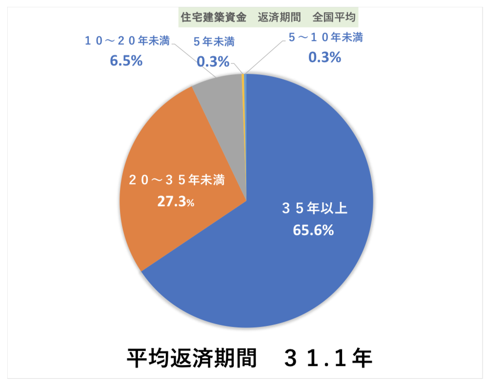 平均返済期間で見ると「31.1年」となっていますが、返済期間が35年以上の方が意外にも多く全体の「65.6%」、20年〜35年未満の方は「27.3%」という調査結果が出ています。