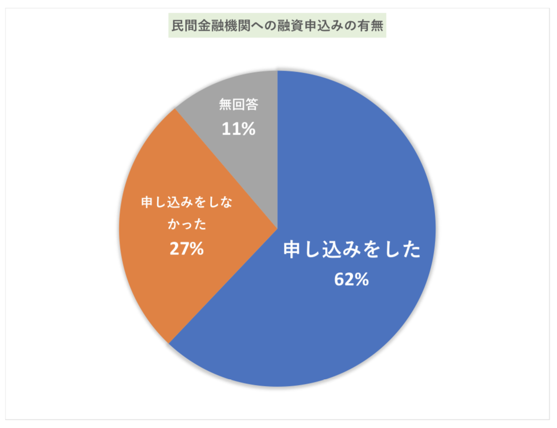 無回答も含んでいますが、民間の金融機関へ融資申込をした方は、全体のおよそ「62%」となっています。