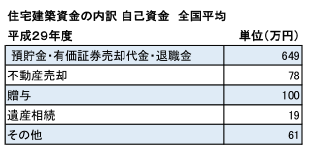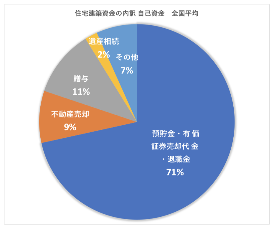 自己資金の内訳はどうなっているのかというと、最も多い比率をしめているのが「預貯金・有価証券売却代金・退職金」となり、全国平均で「649万円」、比率で言うと「71%」をしめています。