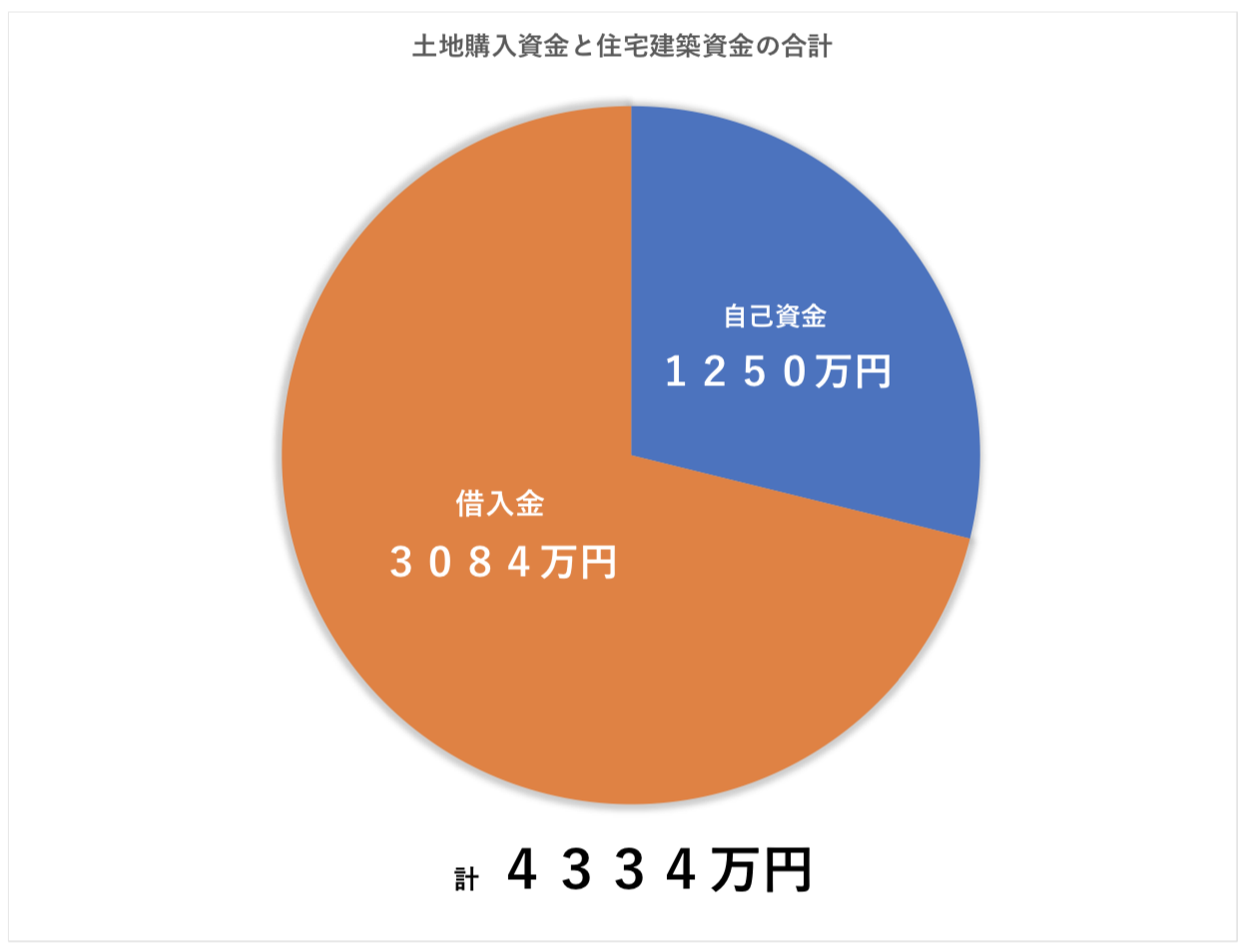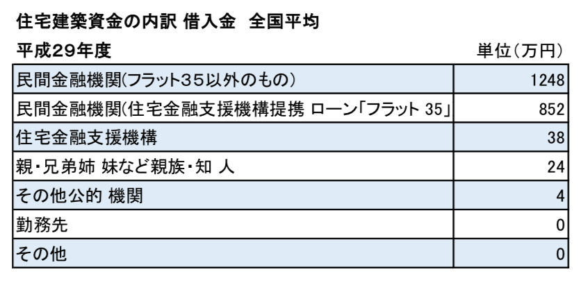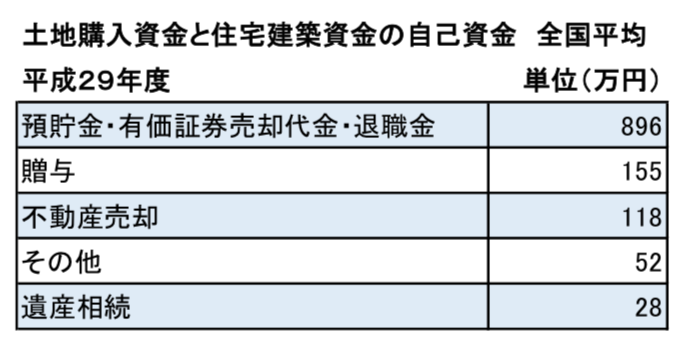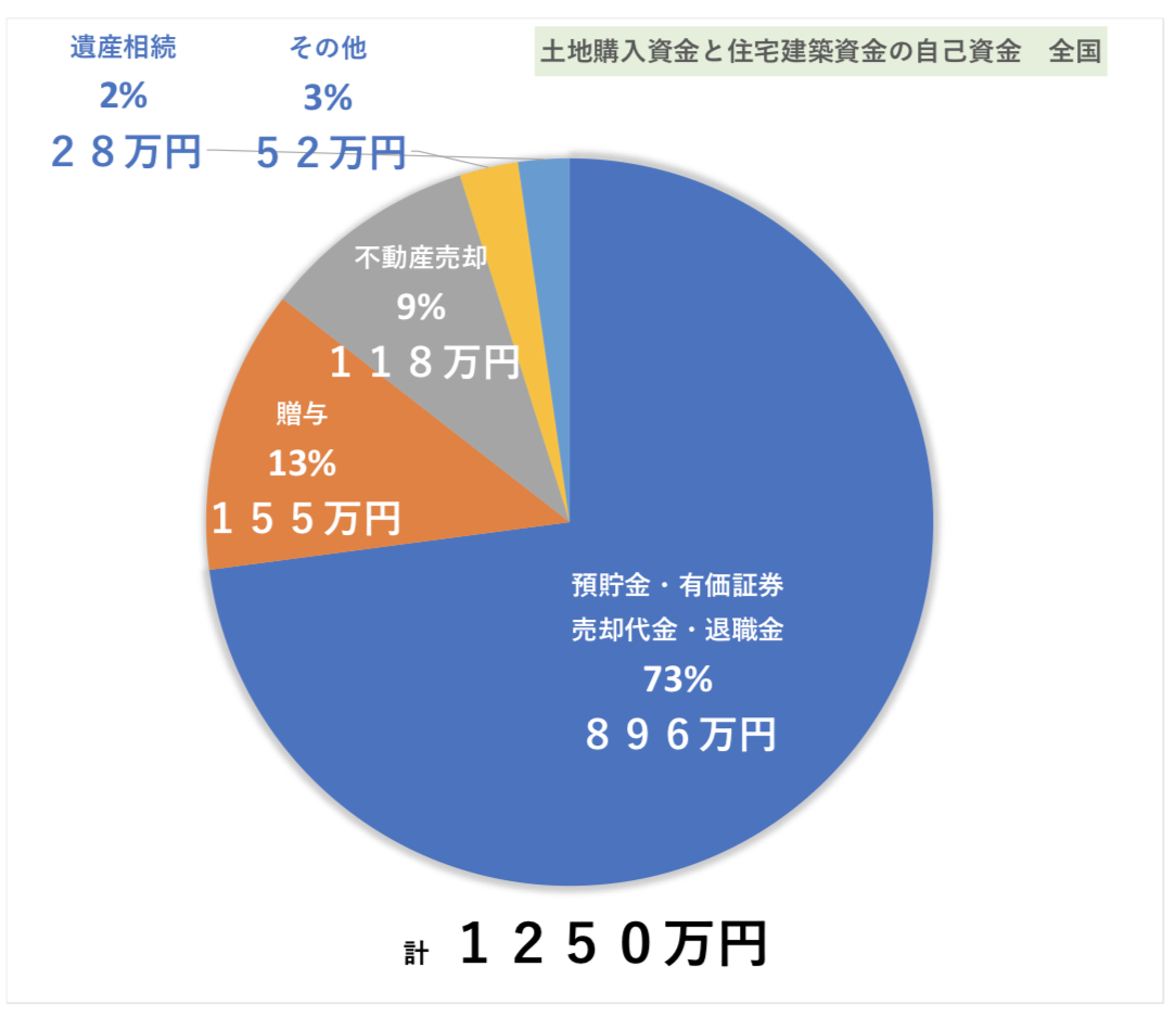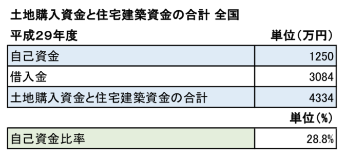 土地購入資金と住宅建築資金の合計は、全国平均で「4334万円」、そのうち自己資金は「1250万円」、借入金は「3084万円」となり、自己資金比率は「28.8%」となっていることがわかります。