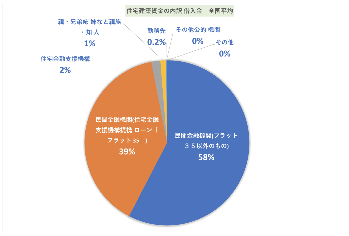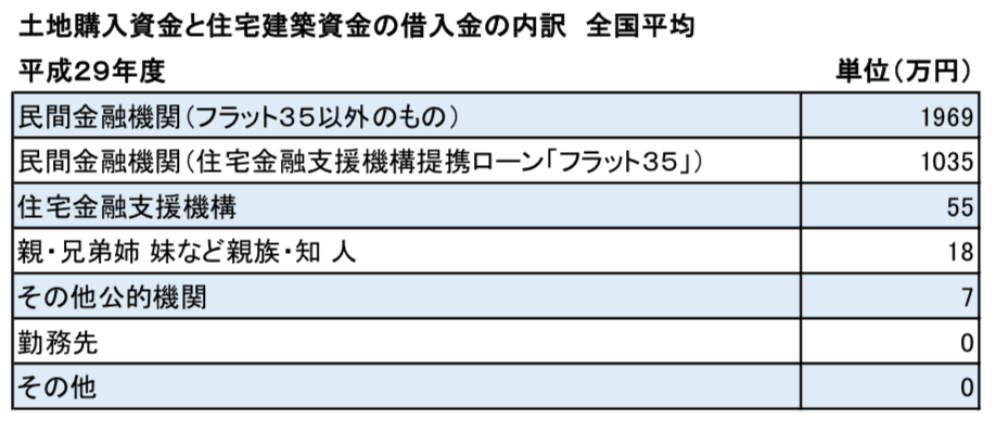 全国平均で見ると借入金のうち、全体の「69%」ほどが民間の金融機関から借り入れており、残りの「29%」が、住宅金融支援機構のフラット35を利用していることがわかります。