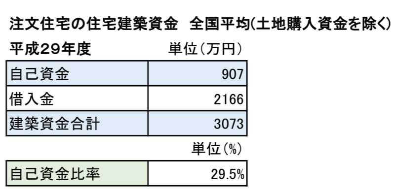 このうち、自己資金は全国平均で「907万円」、借入金が「2166万円」となっており、自己資金比率は「29.5%」と、平均してみると建築資金の3割程度を自己資金でまかなっていることがわかります。