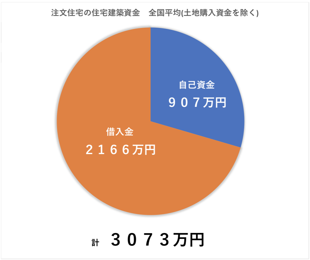 住宅建築資金のうち、建物だけのみ、つまり、土地購入資金を除いた場合の住宅建築資金は、全国平均で「3073万円」となっています。
