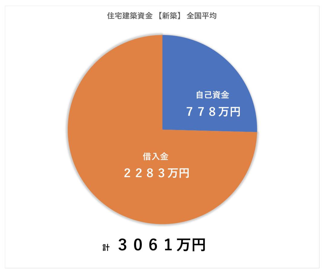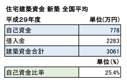 新築世帯に限定してみた場合、建築資金合計が「3061万円」、自己資金で見ると「778万円」、借入金は「2283万円」と公表されており、自己資金比率はおよそ「25.4%」という数値になっています。