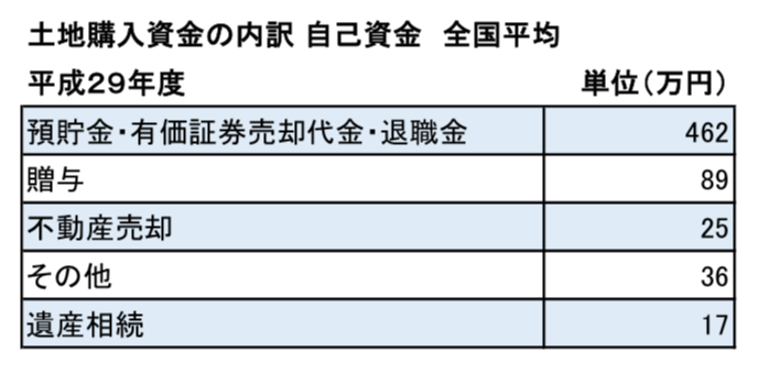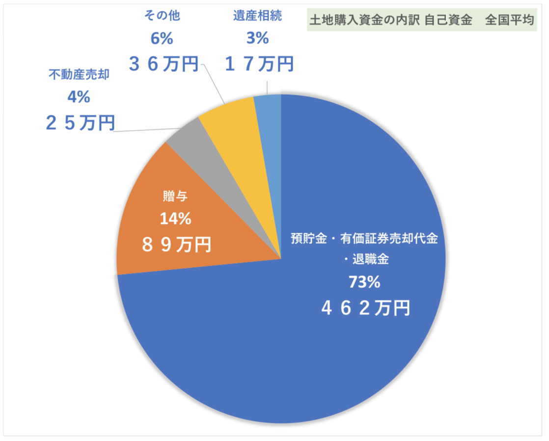 土地購入資金のうち、自己資金の内訳の全国平均をみると、「預貯金・有価証券売却代・退職金」の割合が最も多く「73%」、続いて贈与の「14%」、不動産売却の「4%」と続いていきます。