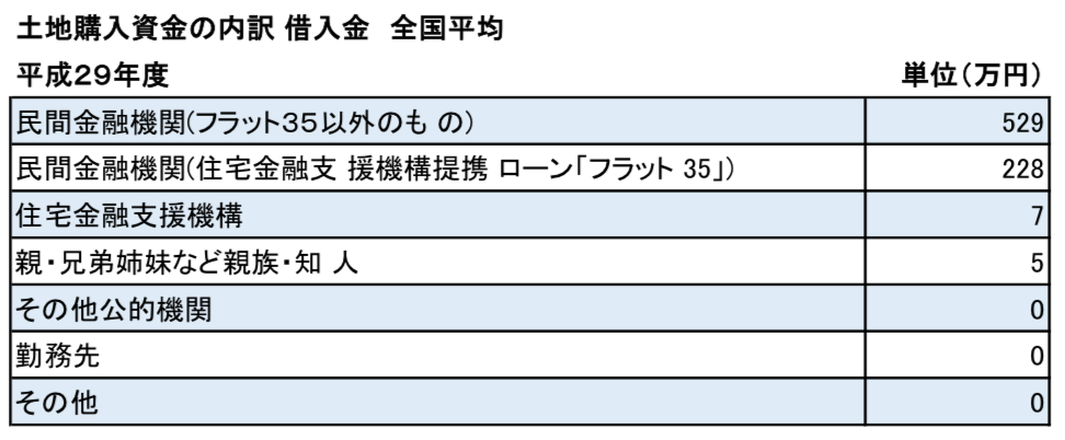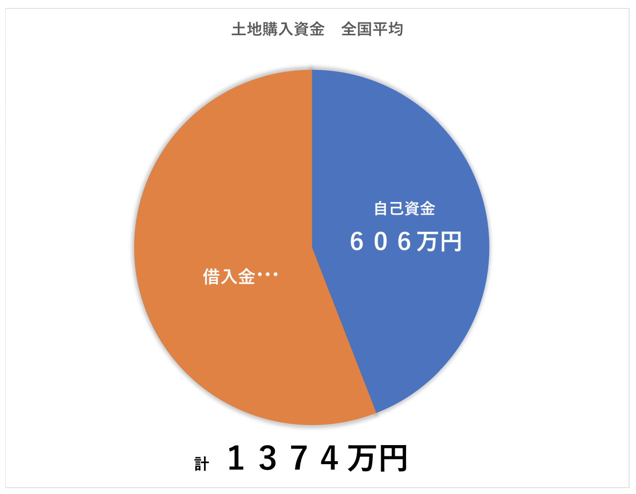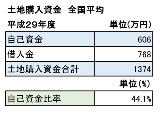 「1374万円」の土地購入費用のうち、自己資金は「606万円」、借入金は「768万円」と土地購入資金のおよそ「44.1%」の資金を、自己資金でまかなっているという統計結果になっています。