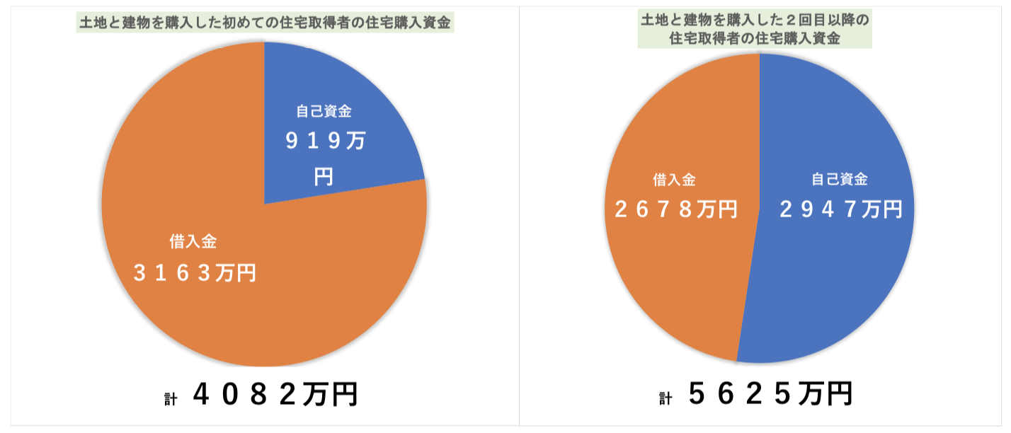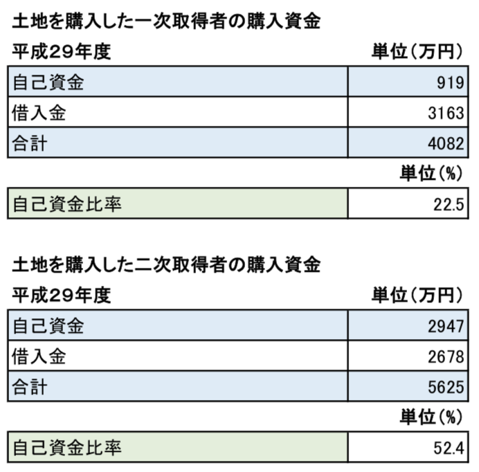 自己資金比率で見ると一次取得者の場合は「22.5%」となっていますが、土地を購入した二次取得者のケースでは総費用のうち「52.4%」が自己資金に充てるなど、半分以上の金額を自己資金でまかなっていることがわかります。