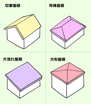(この内、寄棟屋根と方形屋根は一緒にされ「寄棟・方形系の屋根」とされることが多いです)
