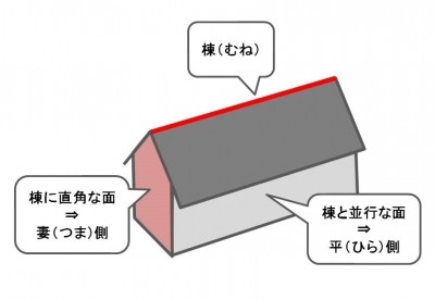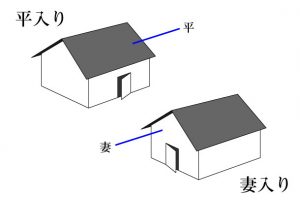 三角形の妻が見えない側(妻のない側の面)のことを「平側(平面)」といい、平側から建物に入ることを「平入り(ひらいり)」といいます。