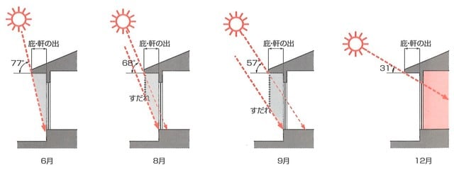 家づくりの現場では、軒を深くとったり、庇(ひさし)を設けることで、雨仕舞いをよくする方法が取られます。