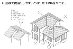 台風などで雨が降り、風が強い場合は、屋根と壁の際(きわ)の部分から雨が内部に入りやすくなってしまいますので、如何にして雨に弱い部分の雨仕舞いをするかが、一つのポイントとなります。