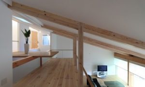 片流れ屋根は、「吹き抜け」の間取り(空間の取り方)と相性が良く、登り梁形式(のぼりばりけいしき)の片流れ屋根にすることで、視線の抜けが良い開放的な空間にすることも検討できます。