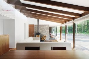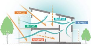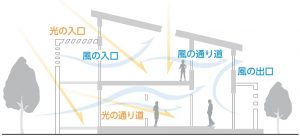 天井の「高い」部分と「低い」部分で強弱が生まれ、高さにメリハリのある空間をつくれることや、「通風」や「採光」の計画などにも有効で、高低差を利用して高い部分に窓をつくり、さらにハイサイドライトなどを設ければ、風通しがよく明るい内部空間をつくることができます。